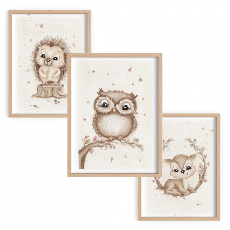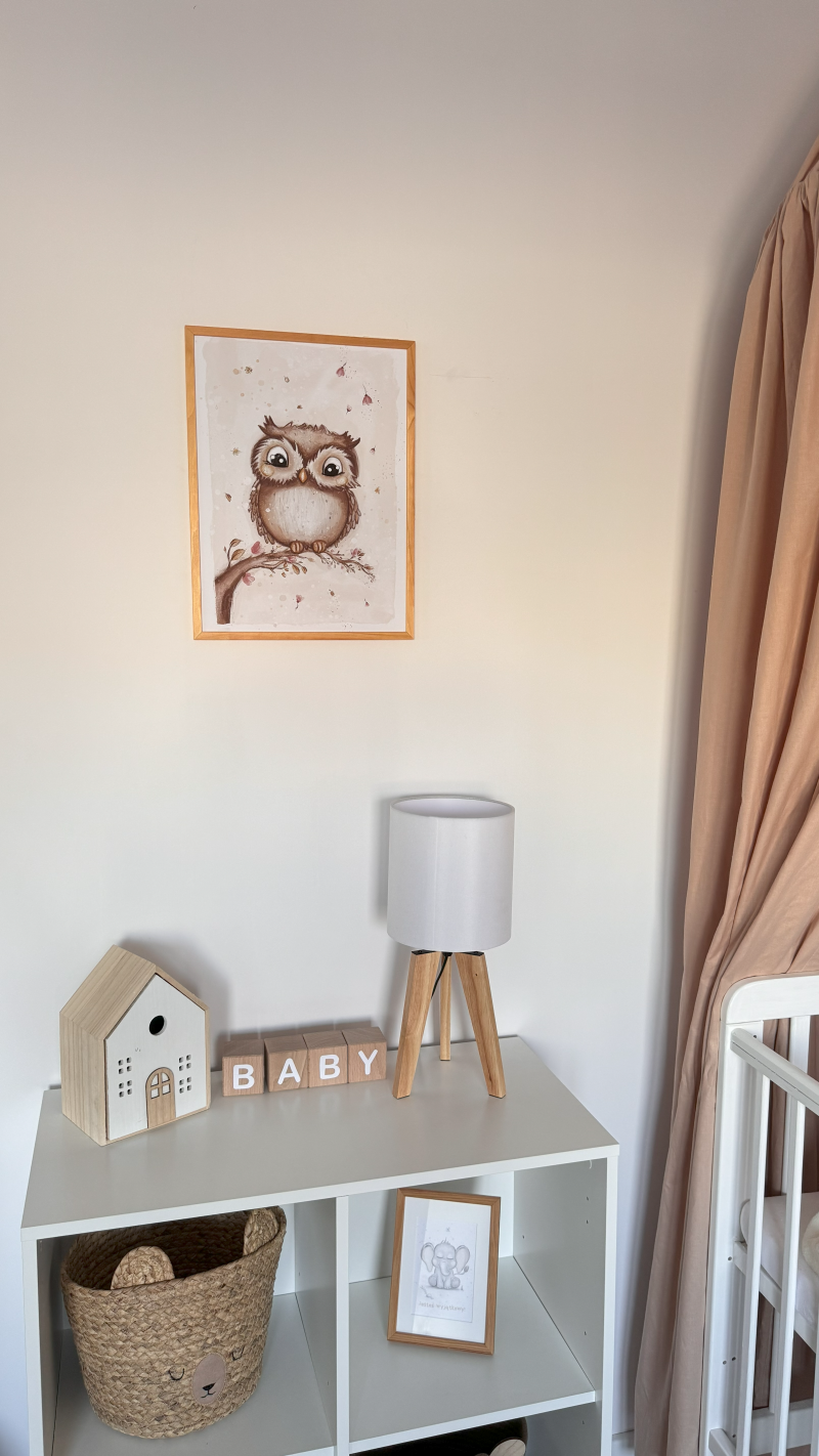 Doskonale sprawdzi się jako ozdoba nad łóżeczkiem, komodą lub w kąciku do zabawy. Możesz go zestawić z innymi plakatami z tej serii – z jeżykiem, wiewiórką i sarenką – tworząc harmonijną galerię ścienną w stylu leśnym.